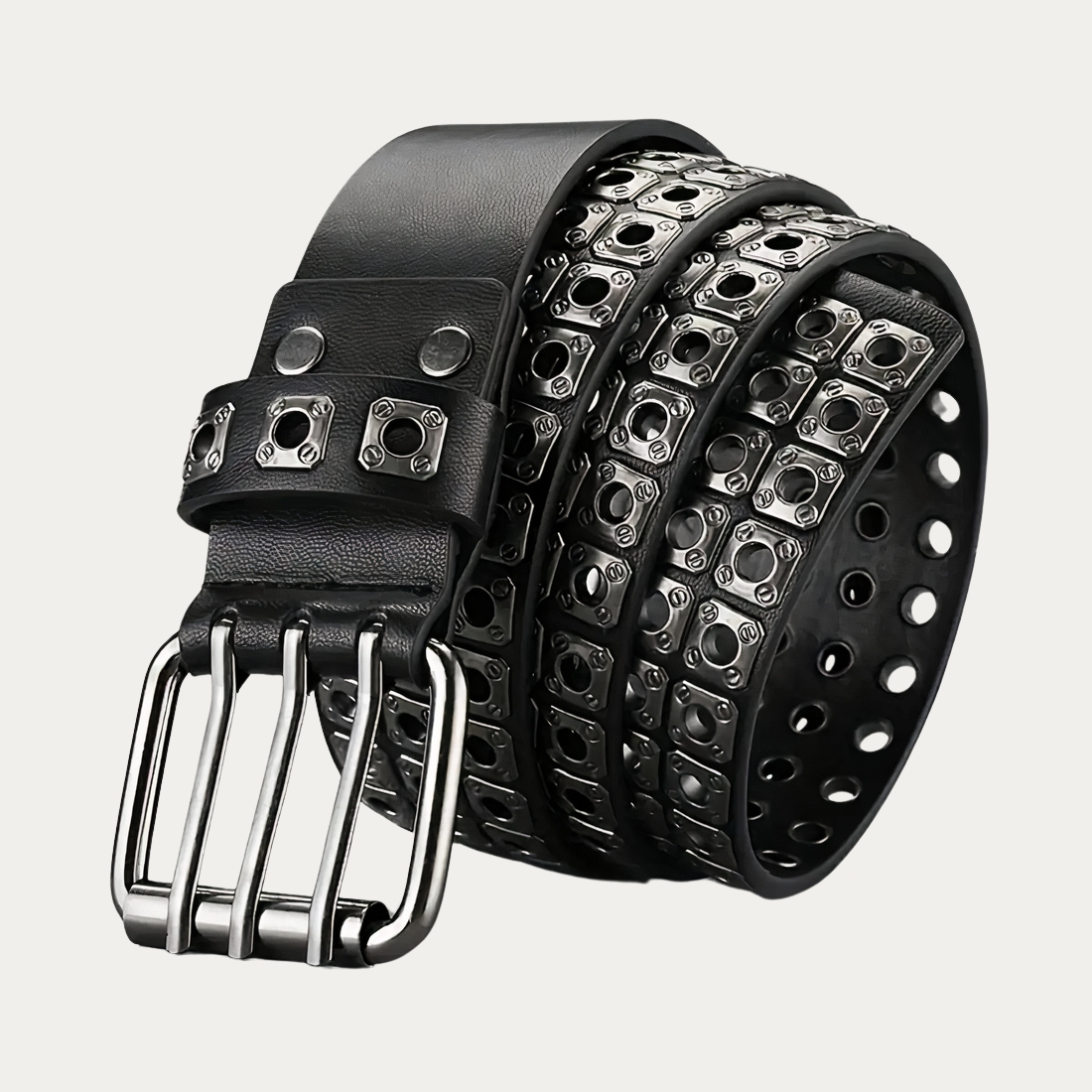 Conçue en cuir noir pleine fleur, cette ceinture offre un toucher dense, mat et vibrant. Les rivets métalliques, vissés un à un sur trois rangées, épousent le cuir avec une régularité graphique saisissante. Portée sur une silhouette sobre, elle devient point focal.