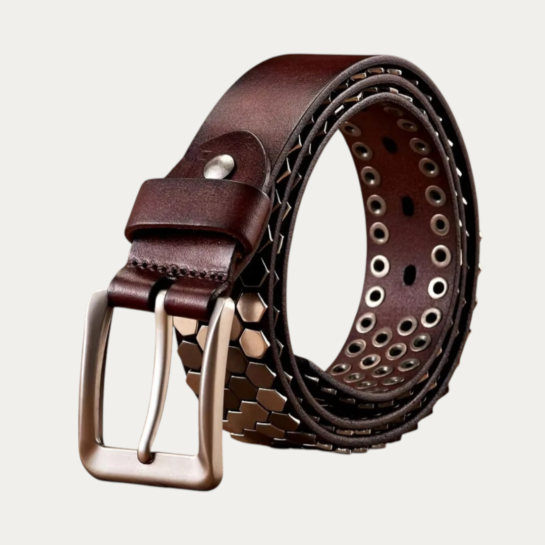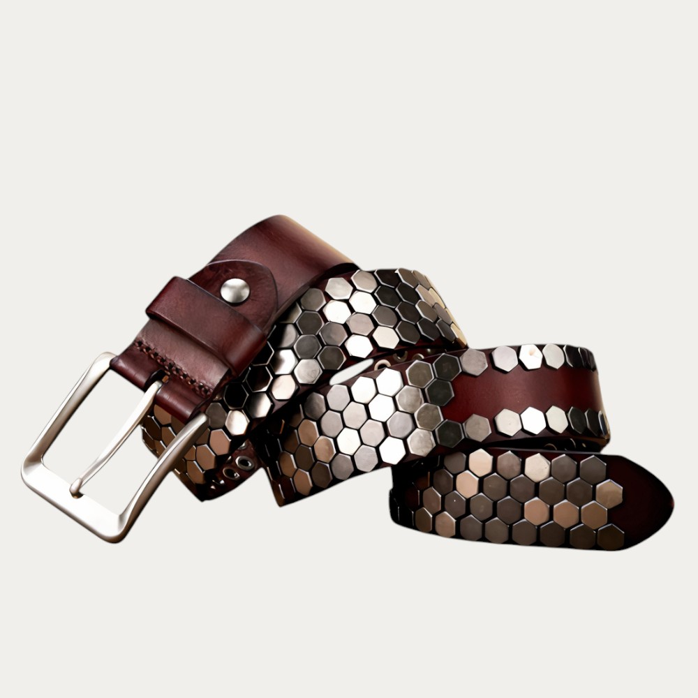 Cette ceinture ne fait pas de compromis, elle ne cherche pas l’approbation de votre entourage. Chaque rivet hexagonal capte la lumière naturellement. Le cuir brut, patiné avec intention, parle d’authenticité.